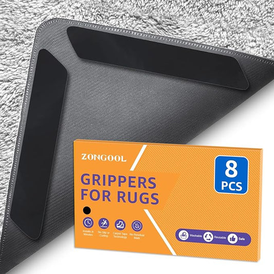 ZONGOOL 8 PCS Rug Tape, Reusable Washable Carpet Tape, Double Sided Non-Slip Rug Pads for Hardwood Floors, Rug Stoppers for Area Rugs, Black
