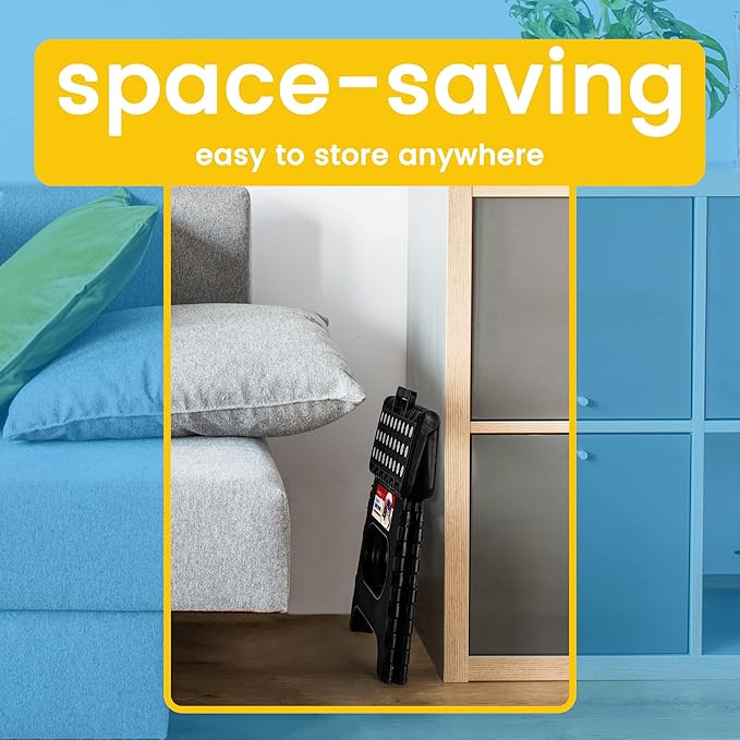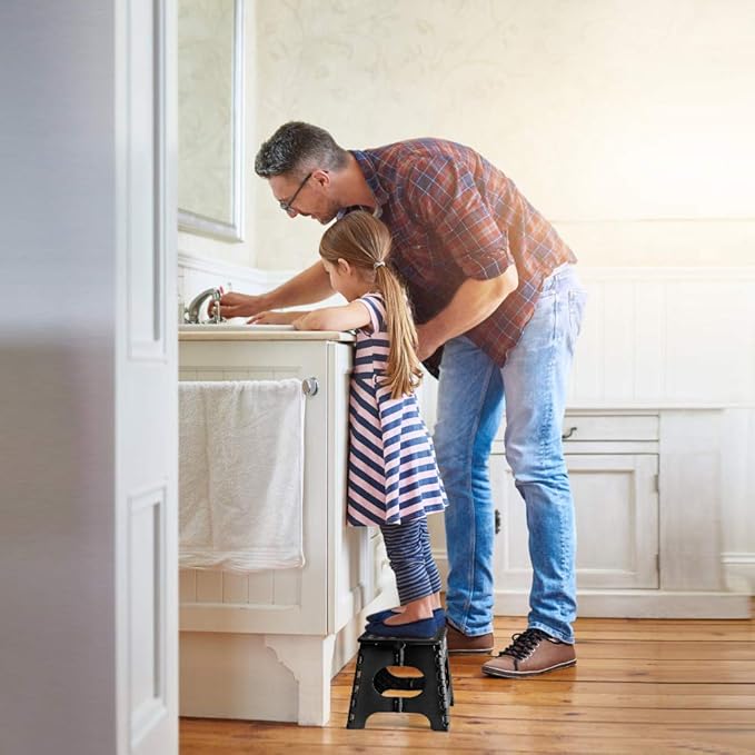 - CARRYING HANDLE AND FOLDABLE - Ergonomic carrying handle is designed for easy folding and carrying. Just lift the handle, it will fold easily and quickly in a split second with only one hand. The collapsible step stool’s handle magically appears when the stool is folded flat.