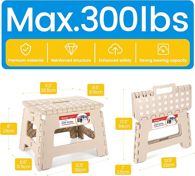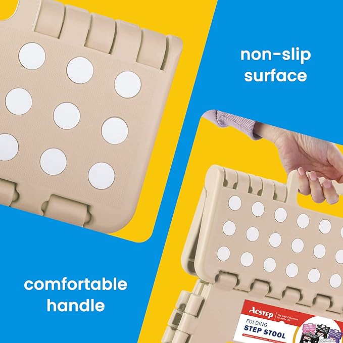 ACSTEP Folding Step Stool Lightweight Plastic Step Stool 9 Inch Foldable Step Stool Non Slip Folding Stools for Kitchen Bathroom Bedroom Khaki