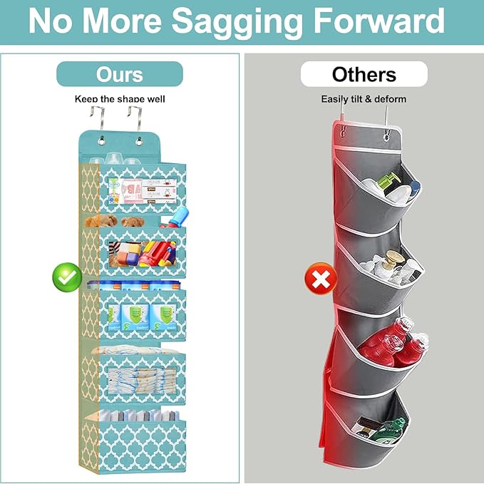 - 【VERSATILE DESIGN】- Over the door hanging organizer can neatly store and classify socks, diapers, baby cloth, panties, toiletries, scarves, hats, towels, bottles, toys, snack pantry foods, bath and beauty supplies and other personal or family items. you can hang it in nursery, bathroom, pantry, laundry room, play room, apartments, kids room etc.
