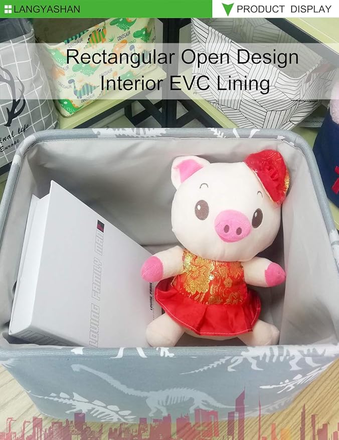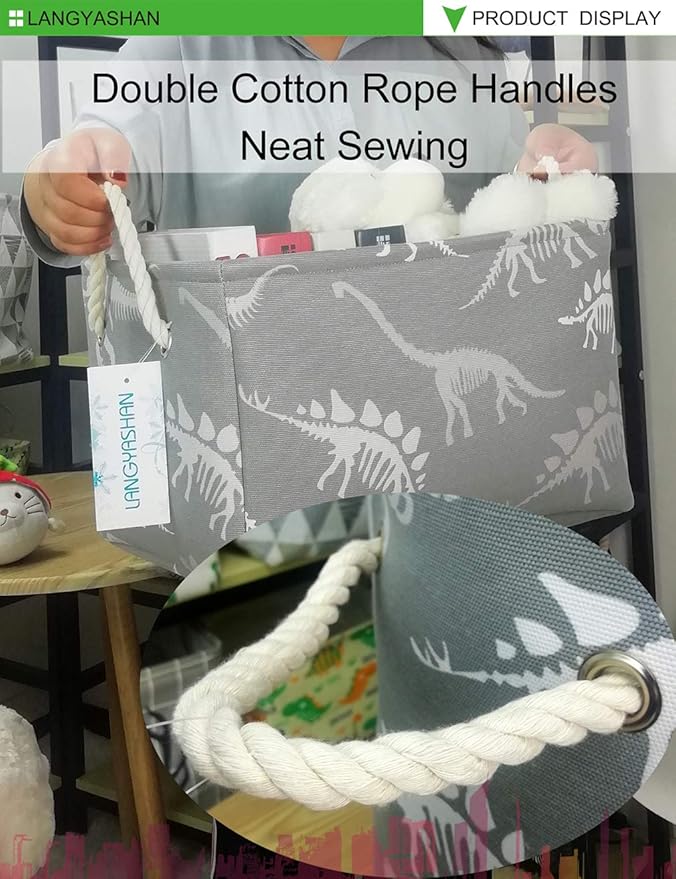 LANGYASHAN Rectangular Storage Bin Collapse Canvas Fabric Cartoon Storage Basket with Handles for Organizing Home Kitchen Boys and Girls Toys Office Closet Shelf Baskets (Rec Gray Dinosaur skeleton)