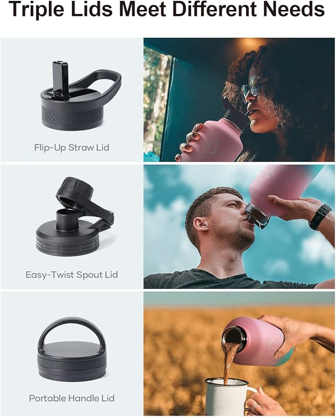 - 3 Caps Pack, 100% Leak-Proof: BUZIO stainless steel water bottle comes with 3 lids: portable handle lid, easy-twist spout lid, and flip-up straw lid