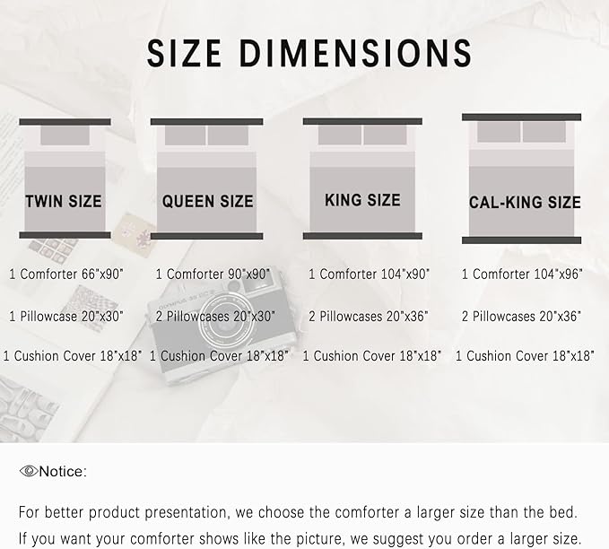 - King Size : 4 Pcs King Comforter Set includes one comforter measures 104x90 inches, two pillow cases measure 20x36 inches, and one decorative pillowcase measures 18x18 inches