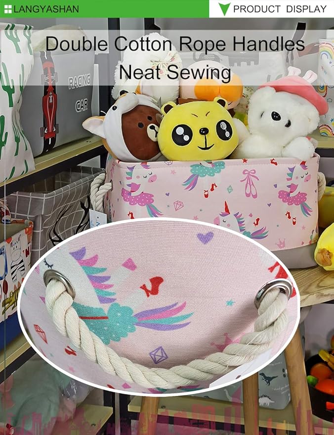 LANGYASHAN Rectangular Storage Bin Collapse Canvas Fabric Cartoon Storage Basket with Handles for Organizing Home Kitchen Boys and Girls Toys Office Closet Shelf Baskets(Rec Pink Dancing Unicorn)