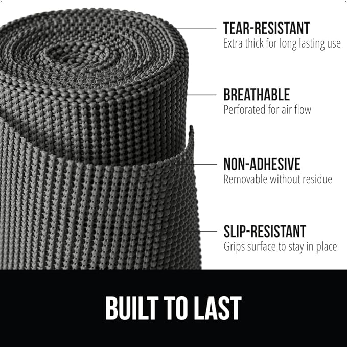 - EXTRA STRONG GRIP NON-ADHESIVE LINER: the Gorilla Grip powerGRIP liner is a non adhesive and tear resistant liner engineered with the highest quality materials to reduce slipping and bunching in your drawers or cabinet shelves; superior gripping technology keeps both the liner in place on surfaces
