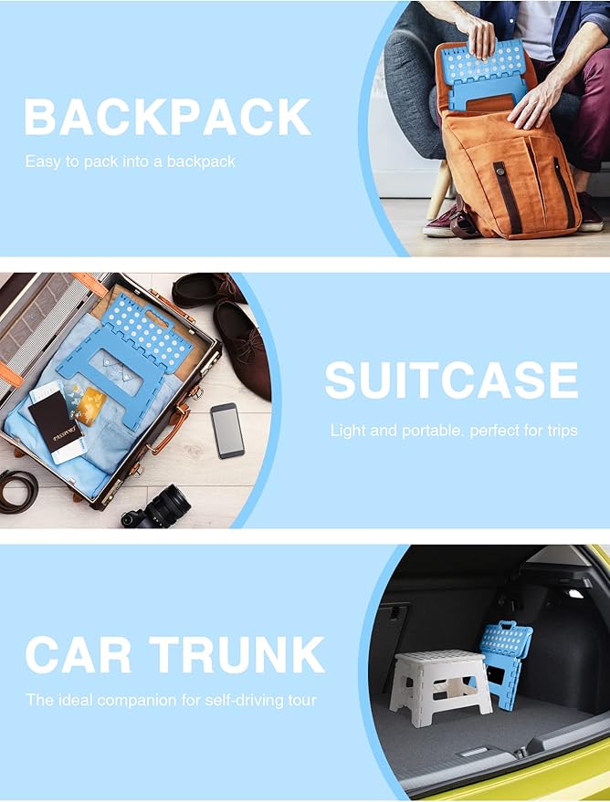 - [Anti Slip Rubber Base] - Special rubber dots on the kitchen step stool surface and anti-slip black rubber strap on each foot for maximum foot grip and gives amazing comfort, preventing slippage. Unique and grip-dot textured surface make the portable step stool safe for everyone. Ideal for Kids, Children and Adults.