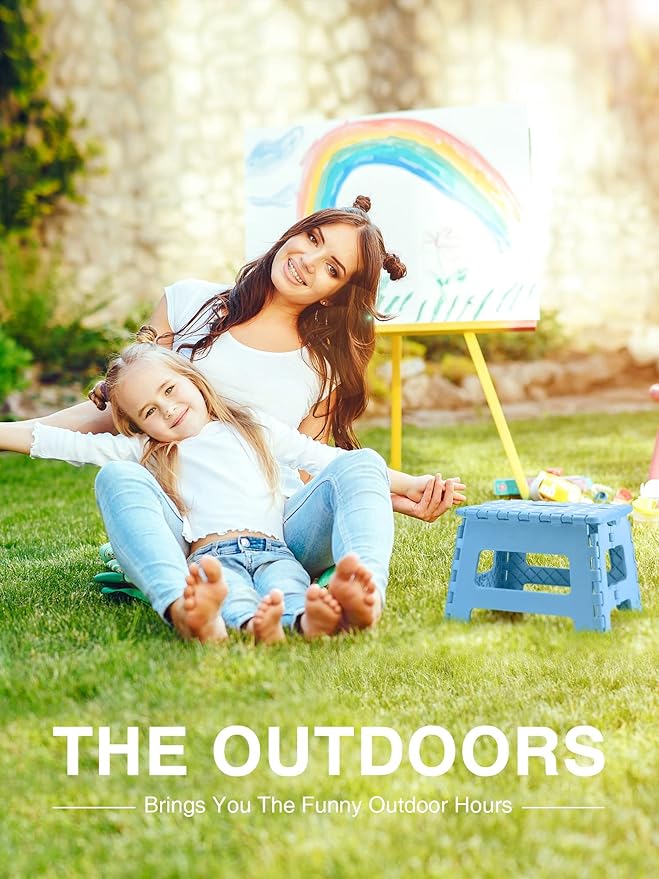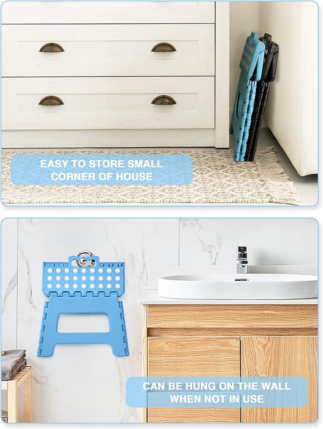 - [Fold Up & Opens Easy] - Ergonomic carrying handle is designed for easy folding and carrying. Just lift the handle, it could be quickly and easily folded away for storage. The handle of child step stool magically appears when the stool is folded flat, allowing you to take it around so you can place it where you need it.