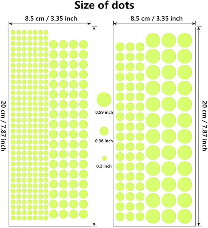 - ♥【Package Includes】 -- Comes with 1 Luminous moon (30cm x 30cm), 407 Dots (0.5cm-- 1.5cm), 27 stars (3.6cm--14.8cm), totally 435 pcs Luminous wall stickers in one pack.