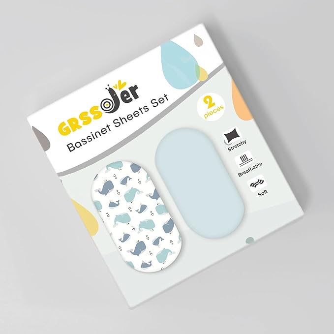 Stretchy Ultra Soft Fitted Bassinet Sheet Set 2 Pack, Universal Fit for Bassinets Baby Cradle Moses Basket Oval Rectangle Pad/Mattress, Lovely Whale Bassinet Sheets
