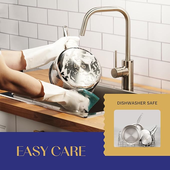 - EASY TO CLEAN & CARE FOR. To maintain the quality of your Legend cookware, allow to cool completely to room temperature. Clean with dish detergent and a sponge or soft mesh scrubber. To maintain luster, polish with water or baking soda and a mild acid, like vinegar or lemon juice. Dishwasher safe, but handwashing is best. Stainless steel copper core pots & pans require no special handling, unlike cast iron, pure copperware, enameled and nonstick clad cookware.