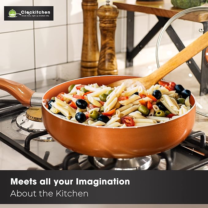Clockitchen Non Stick Pots and Pan Set, 10pcs Cookware Set with Ceramic Coating, Non-toxic Pan Set Compatible with All Stoves, Dishwasher Safe, Copper