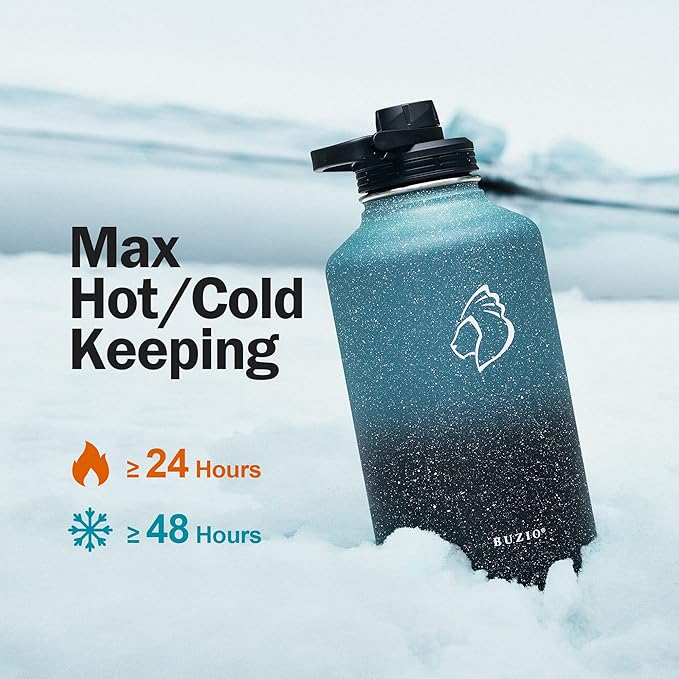 - Vacuum Insulated Water Bottle: Made of double wall 18/8 food-grade stainless steel, BUZIO ThermoArmour water bottle keeps liquids icy for up to 48 hours or hot for up to 24 hours.