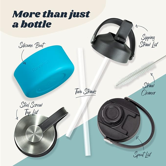 - GREAT VALUE: Every Revelist 32 oz water bottle comes with THREE different 100% LEAK PROOF lids - Straw Lid with 2 Straws, Flip Top Spout Lid and Stainless Steel Screw Top Lid - along with protective silicon boot and straw cleaner.