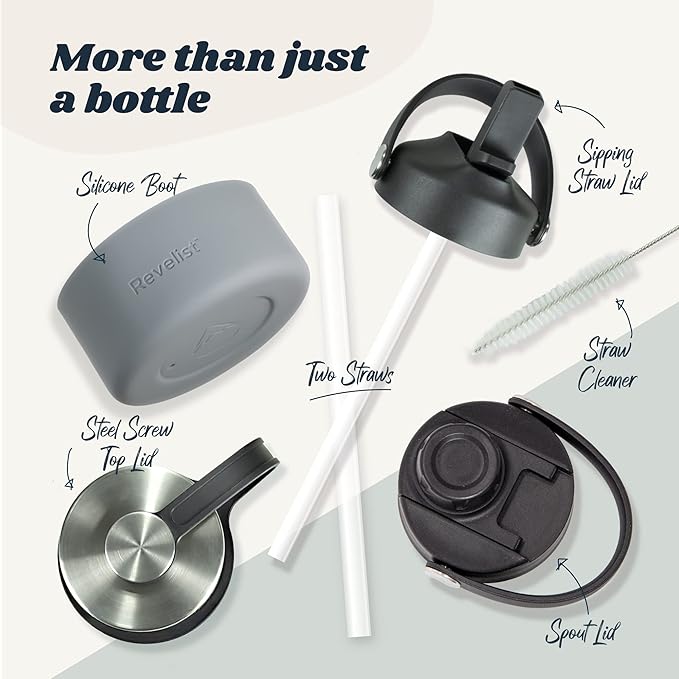 - GREAT VALUE: Every Revelist 32 oz water bottle comes with THREE different 100% LEAK PROOF lids - Straw Lid with 2 Straws, Flip Top Spout Lid and Stainless Steel Screw Top Lid - along with protective silicon boot and straw cleaner.