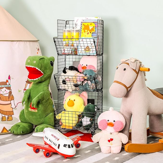 - ROLLING CART & HANGING BASKETS - 3 tier storage baskets together with 4pcs lockable wheels, help you move this rolling storage basket to everywhere you wanted. And install 2 feet increase extra height to keep your kids items away from floor. Also available as wall mount Baskets and floor stand Baskets. You also can use it for a stand-alone basket or stacked for convenience.