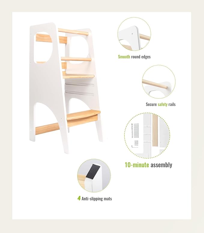 - MUTI-FUNCTIONS: Toddler kitchen stool can elevate your baby to counter height, teach them cooking skills to get a little helper shortly. Make your kitchen full of fun! Also, you could put it in the washing room so kids can brush their teeth by themselves.