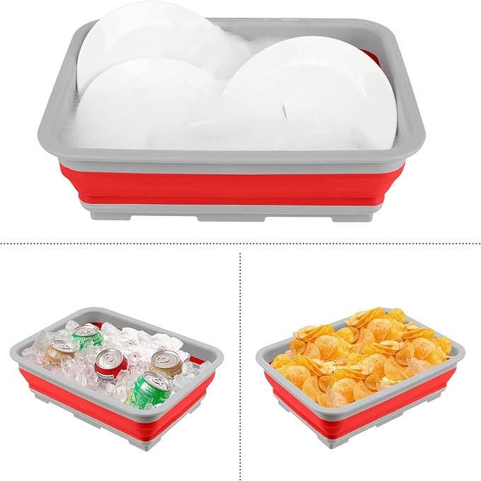 - PRODUCT DETAILS – Materials: Plastic and Plastic Rubber. Dimensions: (L) 14.75” x (W) 10.75” x (H) 5”; Collapsed: (H) 2”. Capacity: 7.27-Liters. Set of 2. May be shipped in separate packages. Color: Red.