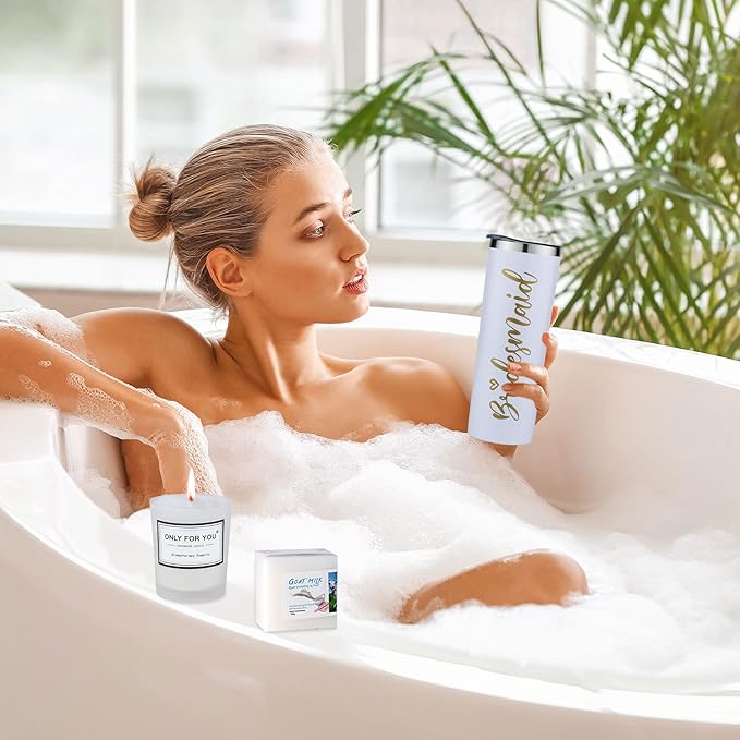 - Perfect Bridesmaid Gift Box: This a simple perfect gift for your bridesmaid . Ask “Will you be my bridesmaid?” Package include:1x Stainless steel champagne flutes,1x jewelry set,1x rose gold bangle,2x silk hair rings,1x goat milk soap,1x candle,1x bridesmaid card,1x bridesmaid gift box
