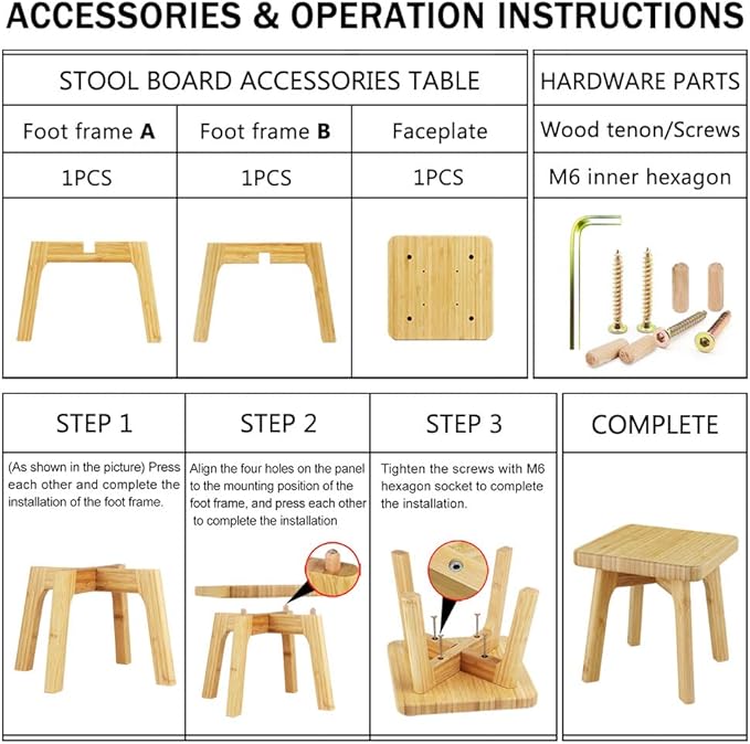 - Easy Assembly - This stepping stool comes with M6 allen wrench, screws, Wood tenons, silent anti-skid pads, and instructions. Standard size of each part makes it easy to assemble your step stool with simple tools. Easily and quickly installed according to the instruction.