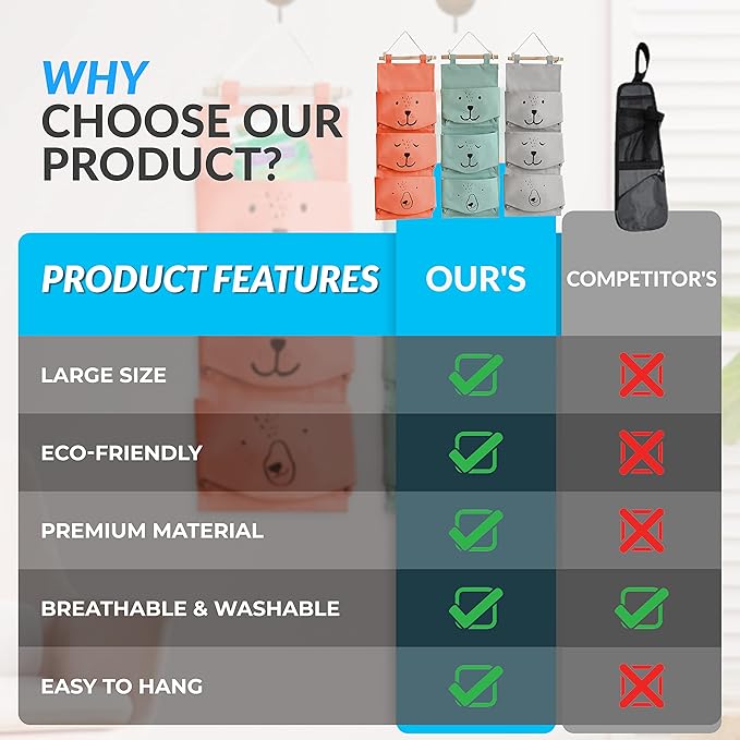 Large Wall Hanging Organizer with 3 Storage Pockets-Space saver for Playroom, Bedroom, Baby Nursery, Bedside, Closet. Cute animal print cubby caddy. Waterproof, Travel Friendly