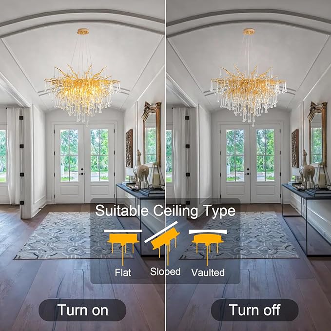 - 【Unique Design】The art chandelier branches with metal finish plating process, corrosion resistant, rust proof, easy to clean, easy to install. Gold finish thickened and encrypted branches, the branches can be manually adjusted. The gold finish adds a warm shine to the sparkly glow from the crystals that drip from the branches of this light fixture. It's perfect for luxury, modern, contemporary, mid-century, French Empire home design.
