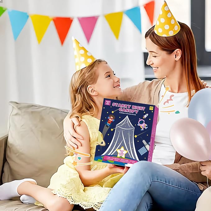 - 【Luxury Present: Lovely & Profound Package】The Starry Night bed canopy is fully protected in Well-designed & Eco-friendly dark blue box (Install Accessoriesses Included). There are interesting pattern for your kids on the package. It is a perfect gifts for kids, such as Birthday, Children's Day, Christmas and so on.
