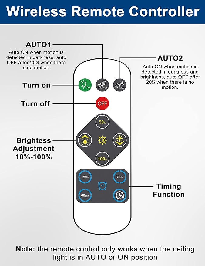 - BATTERY POWERED & EASY WIRELESS INSTALLATION: The ceiling light is powered by 4 D-cell alkaline batteries (NOT INCLUDED), the battery light is easy to set up on walls where have no electricity, ideal for closet, pantry, stairway, shed, porch and storage room where wire can not arrive. The package comes with instructions and accessories to meet your installation needs, without wiring, which makes the installtion easier.