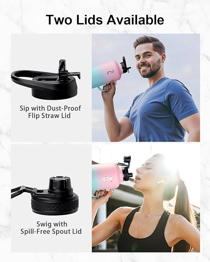 - No Spills, No Worries: Our stainless steel water bottle comes with a dust-proof flip straw lid and a spill-free spout lid, meeting your different needs. With accurate silicone seal rings, they are both 100% leak-proof and spill-proof.