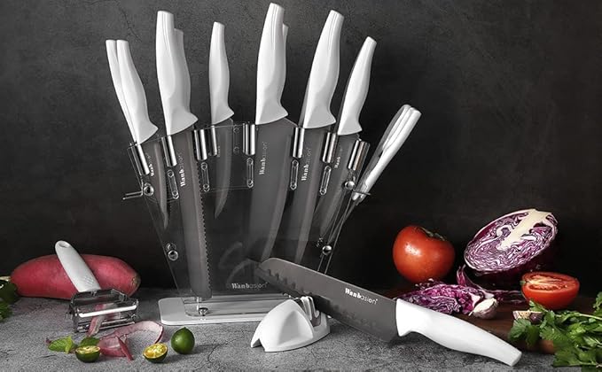 - Stainlsee Steel & Contemporary acrylic Knife Block - Wanbasion kitchen knife set with knife sharpener peeler scissors acrylic block makes for a durable, easy-care universal knife stand that won’t let you down! Universal storage of Wanbasion kitchen knife set block allows you to insert knives anywhere. All kitchen knives can be well organized on a nice and space saving acrylic knife block, the transparent body of the acrylic knife block allows you to easily inspect the status of all the knives