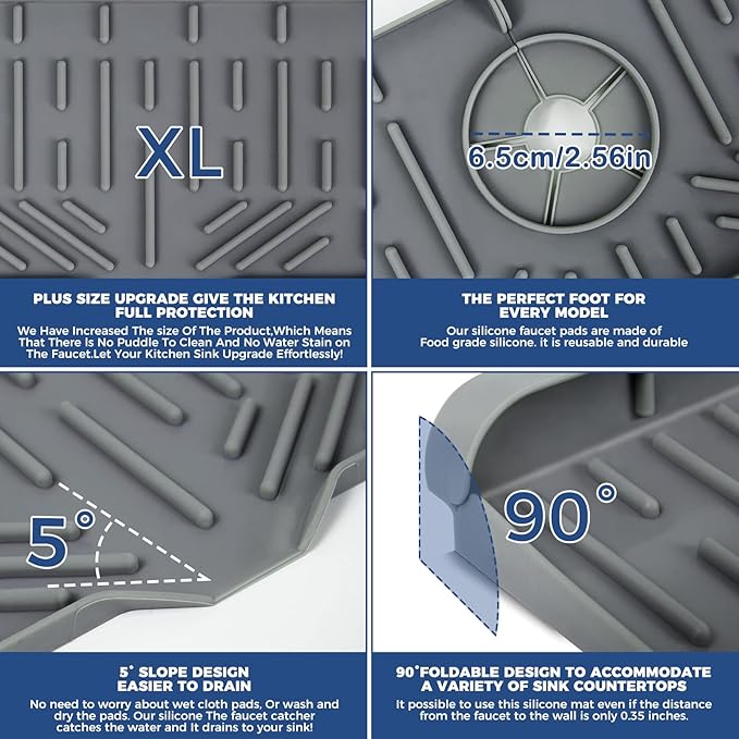 - 💪【PERFECT KITCHEN ACCESSORIES】 Using these silicone faucet splash catchers with their grey luxurious, timeless color and seamlessly blends into your home to create perfect Sink Accessories, add a touch of luxury in your kitchen will give your house an amazing makeover and elevate your home decor.