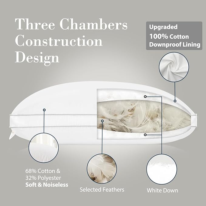 - UNRIVALED SUPPORT AND SOFTNESS: Embrace the perfect balance of support and softness with three-chamber filling design. This unique construction ensures that our feather pillow cradles your head with gentle support while maintaining a sumptuously soft touch. Bid farewell to any discomfort as our premium natural fabric envelopes you in pure opulence.