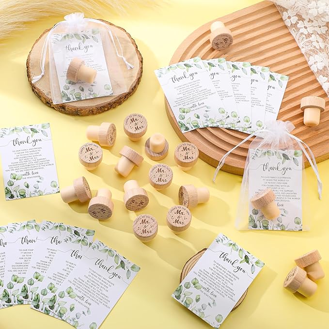 - Meaningful Design: the choice of wine cork as a gift is very creative, and the engraved words [Cheers to the new] are stylish and very commemorative; The wedding thank you cards use green eucalyptus design, simple and generous in appearance