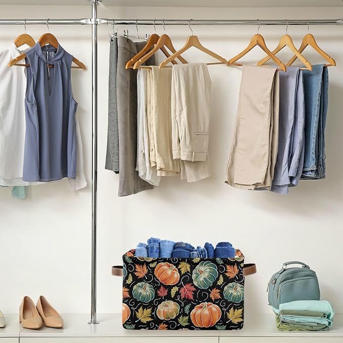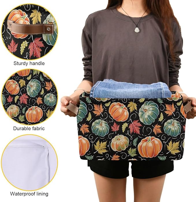 Pumpkin Black Storage Basket Fabric Kitchen Baskets Fall Maple Leaves Autumn Open Home Storage Bins Boxes Foldable Organizer Bag for Baby Cloth Pet Toy Book Shelf Closet Baskets 16×12×8 Inches