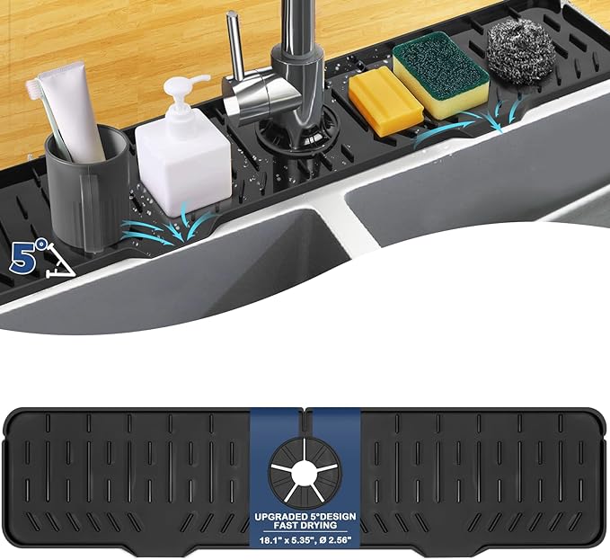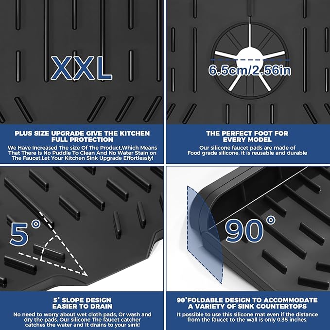 - 💪【5° UPGRADE VERSION】 Silicone sink faucet mat with upgraded 5° slope design and upgraded 0.79" (2 cm) thickness, the kitchen faucet splash guard allows captured water to flow into the sink faster, resulting in faster drying of the kitchen sink. This means never gets soggy, or not having any water spots by the sink faucet. You don't need to worry about the water staying on the sink & bathroom counter. Upgrading your kitchen sink & bathroom countertop in an effort-saving way!