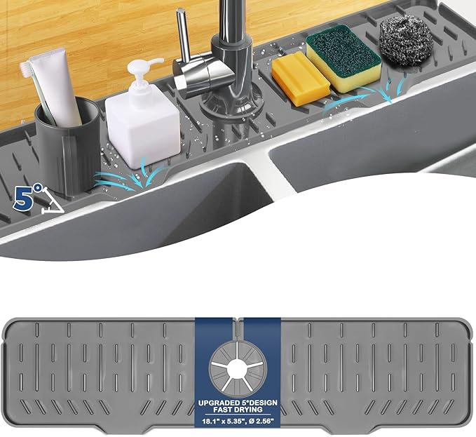 - 💪【5° UPGRADE VERSION】 Silicone sink faucet mat with upgraded 5° slope design and upgraded 0.79" (2 cm) thickness, the kitchen faucet splash guard allows captured water to flow into the sink faster, resulting in faster drying of the kitchen sink. This means never gets soggy, or not having any water spots by the sink faucet. You don't need to worry about the water staying on the sink & bathroom counter. Upgrading your kitchen sink & bathroom countertop in an effort-saving way!