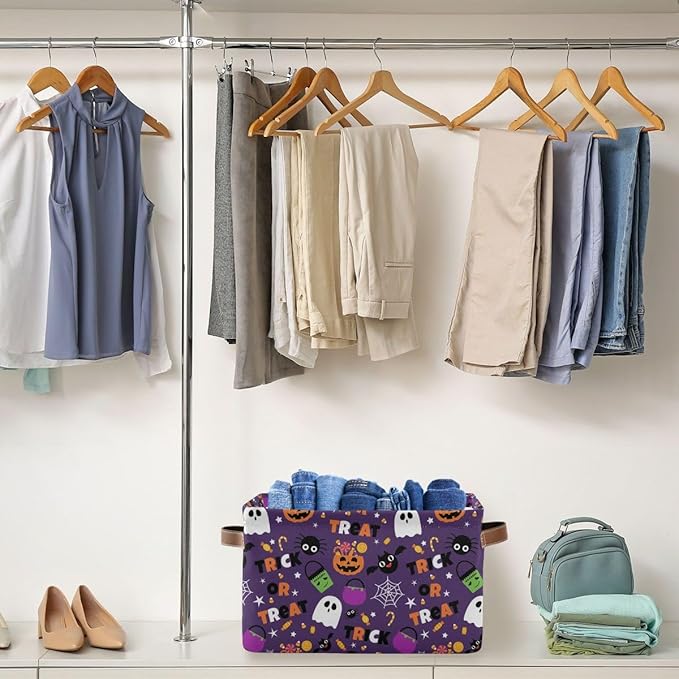 Happy Halloween Purple Storage Basket Fabric Kitchen Baskets Pumpkin Skull Ghost Bat Trick or Treat Open Home Storage Bins Boxes Foldable for Candy Toy Decorations Baskets 16×12×8 Inches