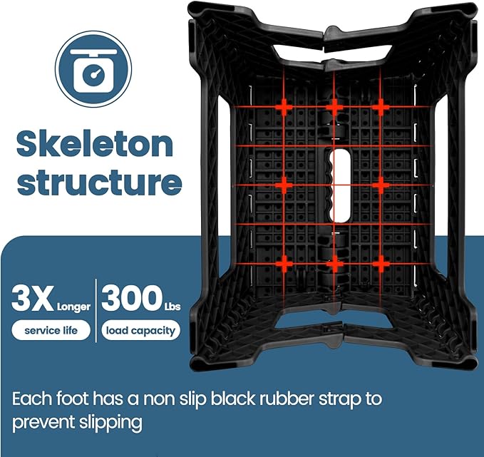 - Sustained Material: To ensure the longevity of our folding stool, it's constructed with Sustained plastic material that can hold up to 300 pounds. This ensures that the step stool will remain a reliable companion for years to come.