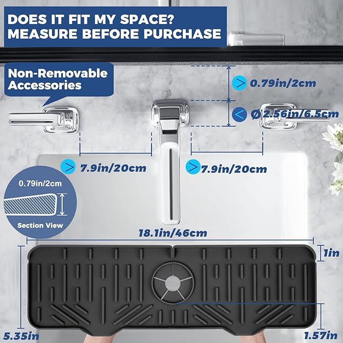 - 💪【XL PLUS SIZE】 XL Size: 18.1"(46cm) x 5.7"(14.5cm) x 0.79"(2cm), Ø 2.56"(6.5cm) Diameter single faucet hole. Not compatible with built in soap dispensers or multi fixture faucets!! BFONS's kitchen sink splash guard have increased size, weight, thickness of our products. Better quality and stability compared to other thin faucet mat. Upgraded supersize, wider space protection, this means no puddles to clean up & no water spots by the faucet. Give your kitchen sink an effort-saving upgrade!