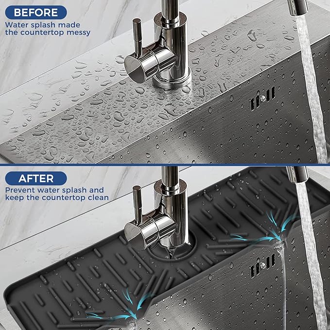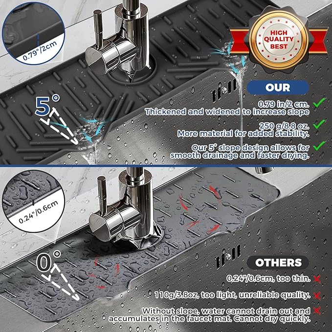 - 💪【5° UPGRADE VERSION】 Silicone sink faucet mat with upgraded 5° slope design and upgraded 0.79" (2 cm) thickness, the kitchen faucet splash guard allows captured water to flow into the sink faster, resulting in faster drying of the kitchen sink. This means never gets soggy, or not having any water spots by the sink faucet. You don't need to worry about the water staying on the sink & bathroom counter. Upgrading your kitchen sink & bathroom countertop in an effort-saving way!