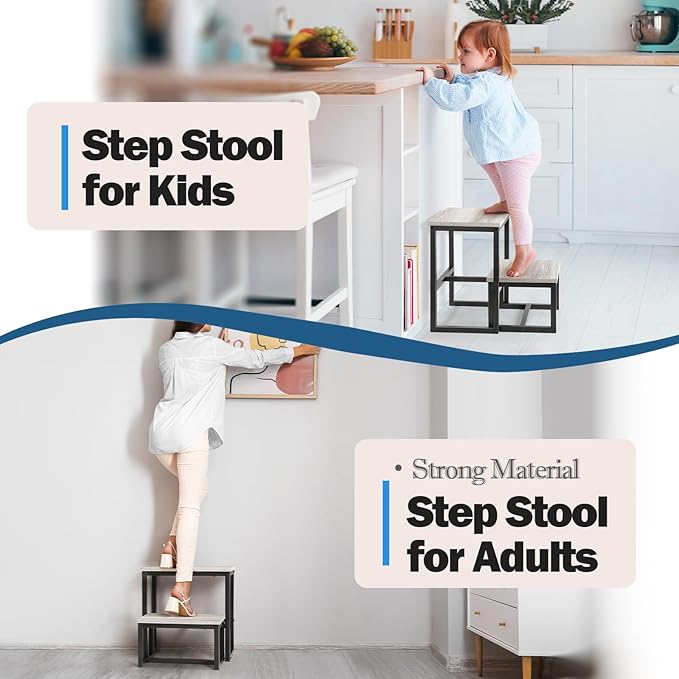 - SAFETY CARE: The wide platform, non-slip texture and non-slip feet, makes the wood stool safe for everyone. Heavy duty iron frame provides more stability and balance. Suitable for seniors, toddlers and adults.