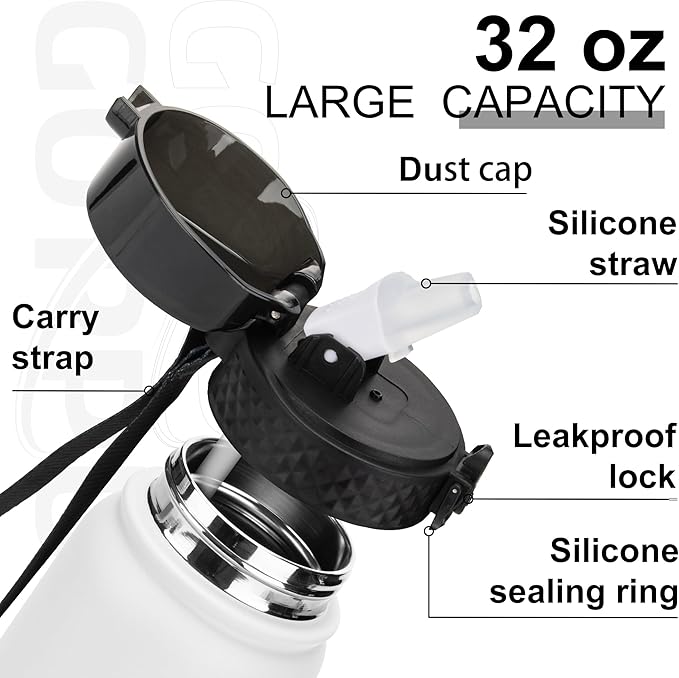 GOPPUS 32 oz Sports Water Bottle 1 Liter Double Wall Insulated Stainless Steel Water Bottles with Straw Lid Reusable Leak proof Metal water bottles with Strap Handle(White Black 1 lid)