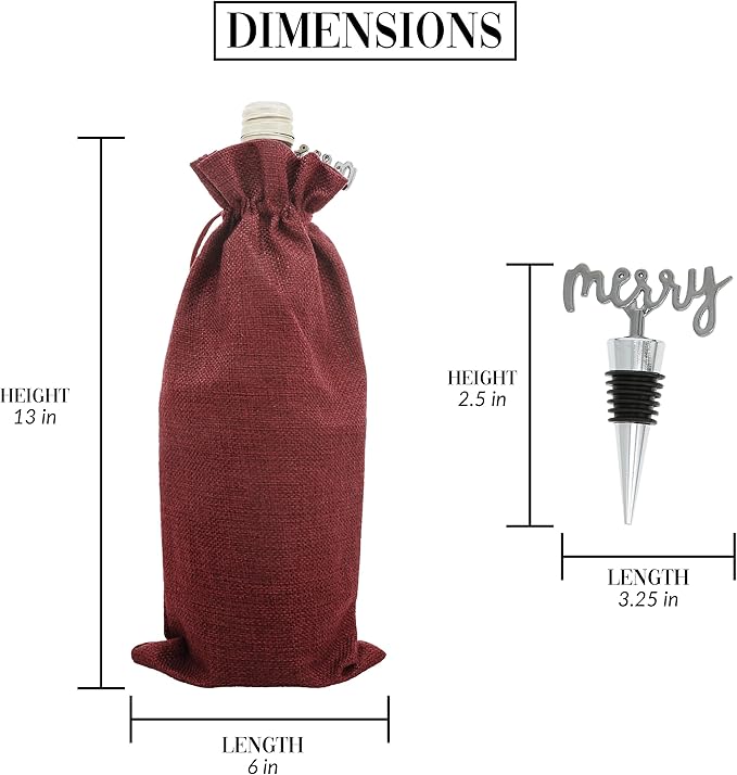 - PREMIUM QUALITY: The 13" tall x 6" long (flat) drawstring burgundy rich red bottle bag is 100% cotton canvas and can hold champagne, wine, and certain liquor bottles. The bottle stopper is zinc alloy with a silicone ribbed wrap to keep a good seal for your wine while refrigerated for 1-5 days.