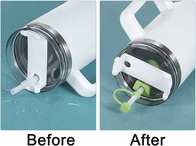 - Advantage: The spill stopper is made of silicone material, which is flexible, durable and convenient to clean. The straw cap can prevent water from spilling out of the straw and keep dust out. The round stopper is installed on the inner side of the cup lid, which ensures sealing while allowing air to enter for easy drinking. The square stopper is installed on the outer side of the cup lid, securing the straw in place and forming a seal to prevent leak.