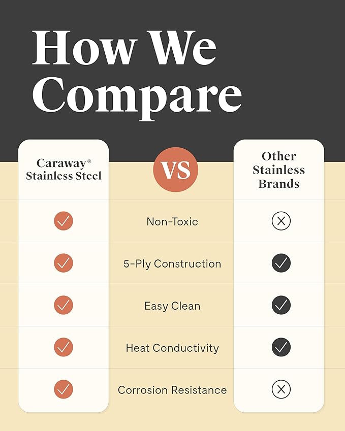 - BRINGS THE HEAT: Elevate your culinary experience with Caraway's 5 ply Stainless Steel Cookware Set designed for optimal heat distribution. Limited lifetime warranty included for a long life of sizzling, searing, and sautéing.