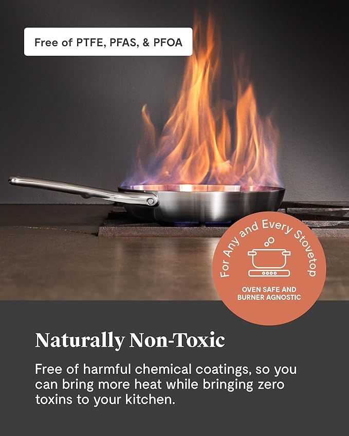 - NON-TOXIC MATERIALS: Cook with confidence knowing our stainless steel cookware is free from harmful materials such as PFOA, PTFE, PFAs, lead, cadmium, and toxic metals. Embrace healthier cooking at higher temperatures without compromising on safety.