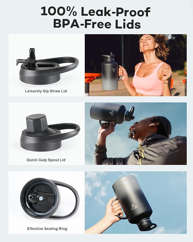 - No Leakage, No Spills: Our stainless steel water bottles comes with a dust-proof flip straw lid and a spill-free spout lid, both 100% leak-proof and spill-proof. The two lids showcase a vibrant color-contrast design, harmonizing with the bottle body's color and adding an extra touch of allure.