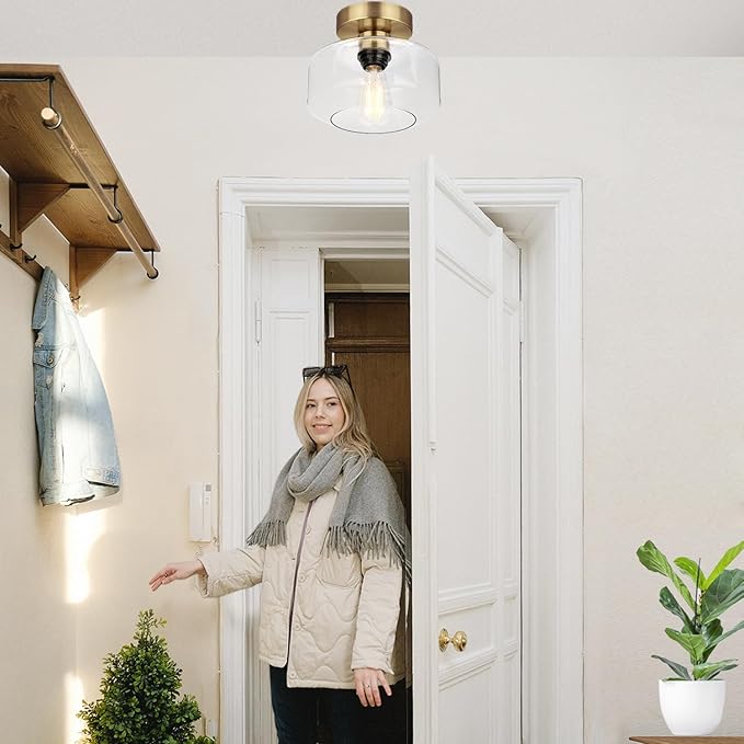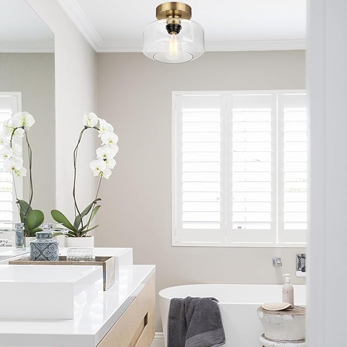 Industrial Semi Flush Mount Ceiling Light Brass, 800 Lumen LED Bulb Included, Clear Glass Shade Ceiling Light Fixture, Light Fixture for Hallway Bathroom Bedroom, Vintage Hanging Light Fixtures