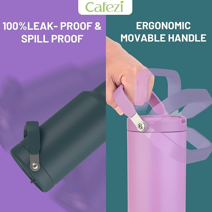 50 oz Insulated Water Bottle, Stainless Steel Water Bottles with Flip Straw and Top Handle, Leak Proof Flip, No Sweat, Fits in Cup Holder, Vacuum Insulated Cup for Home, Office, Outdoors, Car