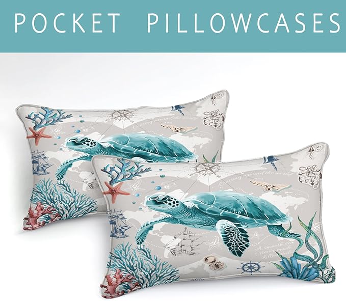Bedbay Coastal Bedding Set Sea Turtle Comforter Set Queen Size for Girls Boys Soft Lightweight Ocean Bedding Quilt Set Beach Room Decor 4 Pcs Retro Turtle Beach Theme Duvet Insert(Turtle,Queen)