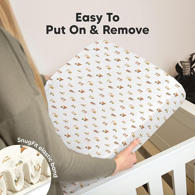 2-Pack Mini Crib Sheets Fitted, Pack and Play Sheets - Organic Cotton Pack N Play Sheets for Pack and Play Mattress, Playard Baby Crib Sheets, Jersey Crib Sheets Neutral for Boys, Girls (Construction)